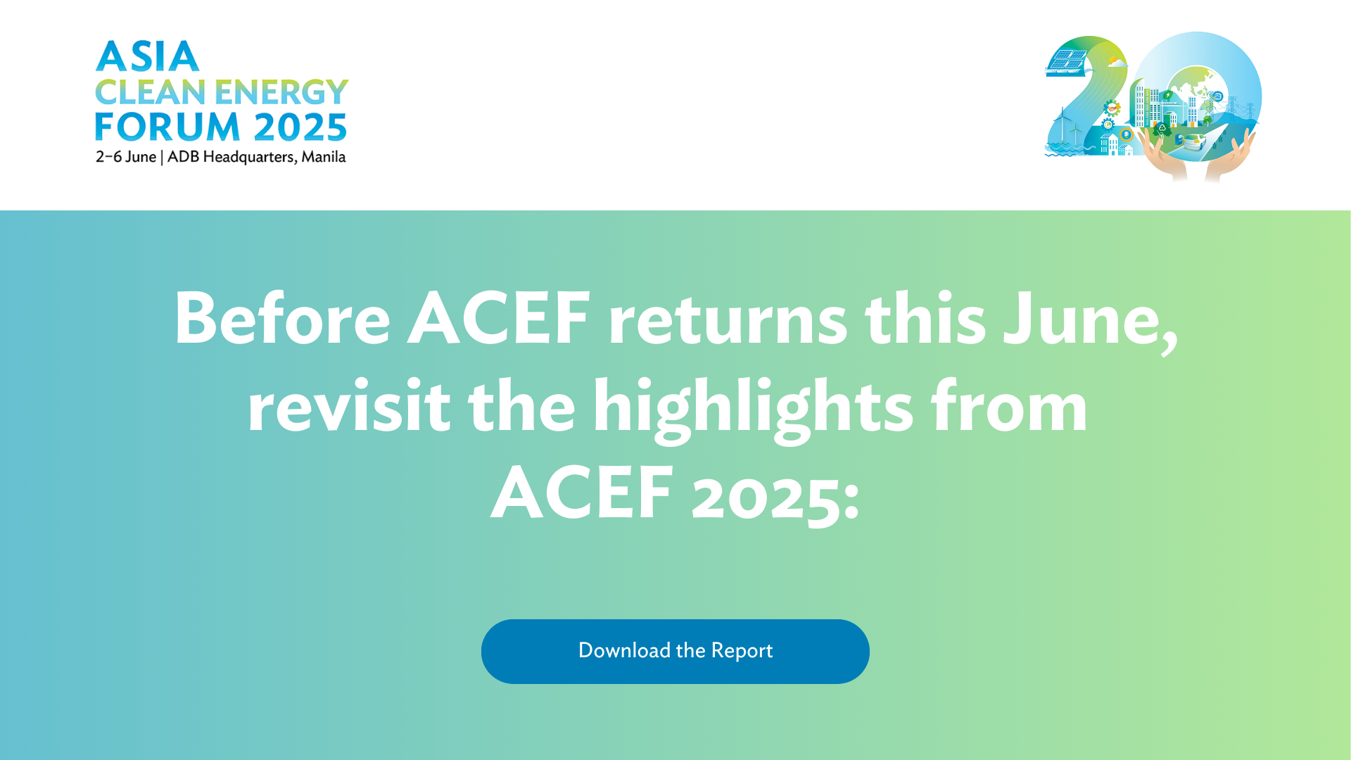 This year, ACEF celebrates its 20th edition, to be held from 2–6 June 2025 at the ADB Headquarters in Manila, Philippines, under the theme “Empowering the future: Clean energy innovations, regional cooperation and integration, and financing solutions.” Co-organized with the Korea Energy Agency (KEA), ACEF 2025 comes at a critical juncture when accelerated clean energy adoption is crucial to meet the demands of rapid urbanization, industrialization, and economic growth in the region.